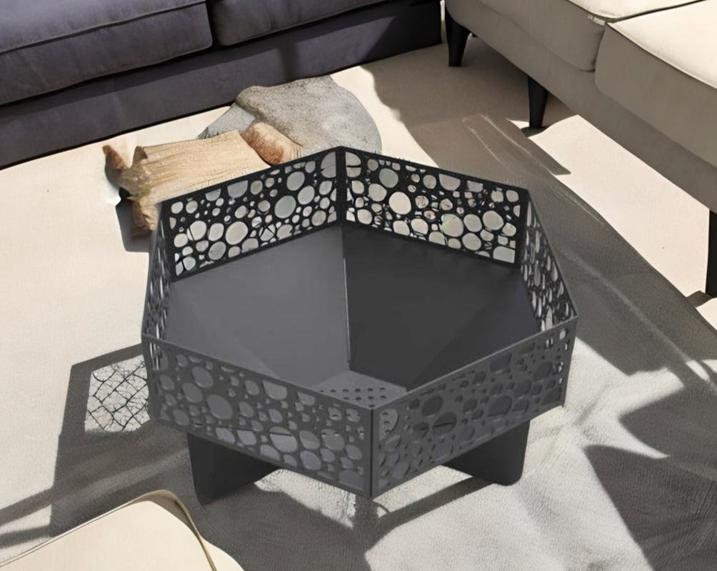 Step into a world of enchantment with the Hexagonal Bubble Fire Pit, a great addition to your outdoor leisure space. The assorted circular cut-outs are not just for show; they enhance airflow, ensuring your fire burns brighter and cleaner.