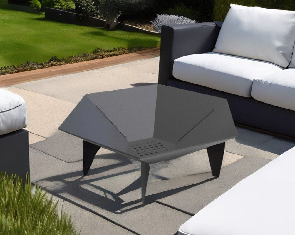 We have a range of hexagonal fire pits, featuring various similar versions tailored to different preferences and needs. Elevate your outdoor living space with the Hexagon IV Fire Pit, a fusion of contemporary design and functional elegance. Set upon slender yet sturdy legs, this fire pit not only enhances the warmth of your gatherings but also complements the modern aesthetic of your garden furniture.